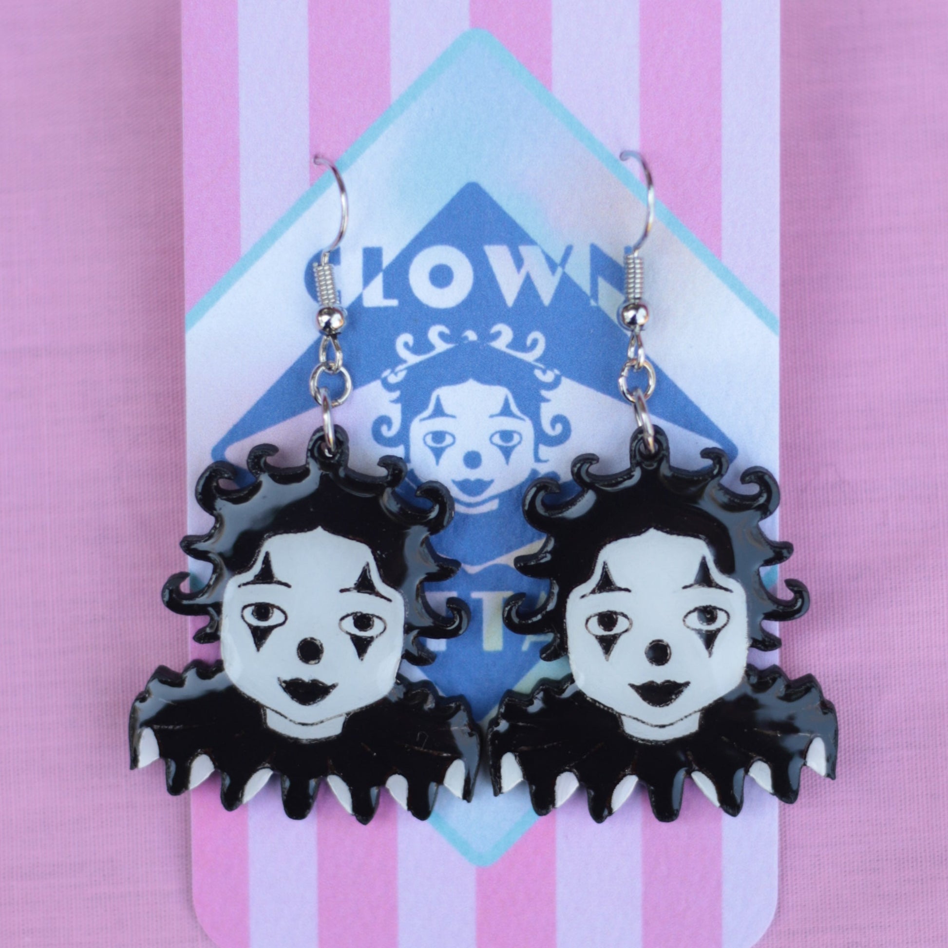 These beautiful clown earrings are made using laser-cut MDF, acrylic paint, resin, and nickel-free metal ear wires.