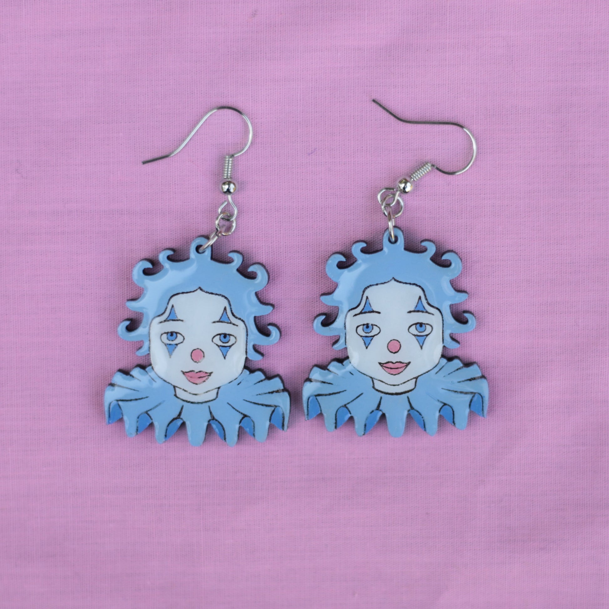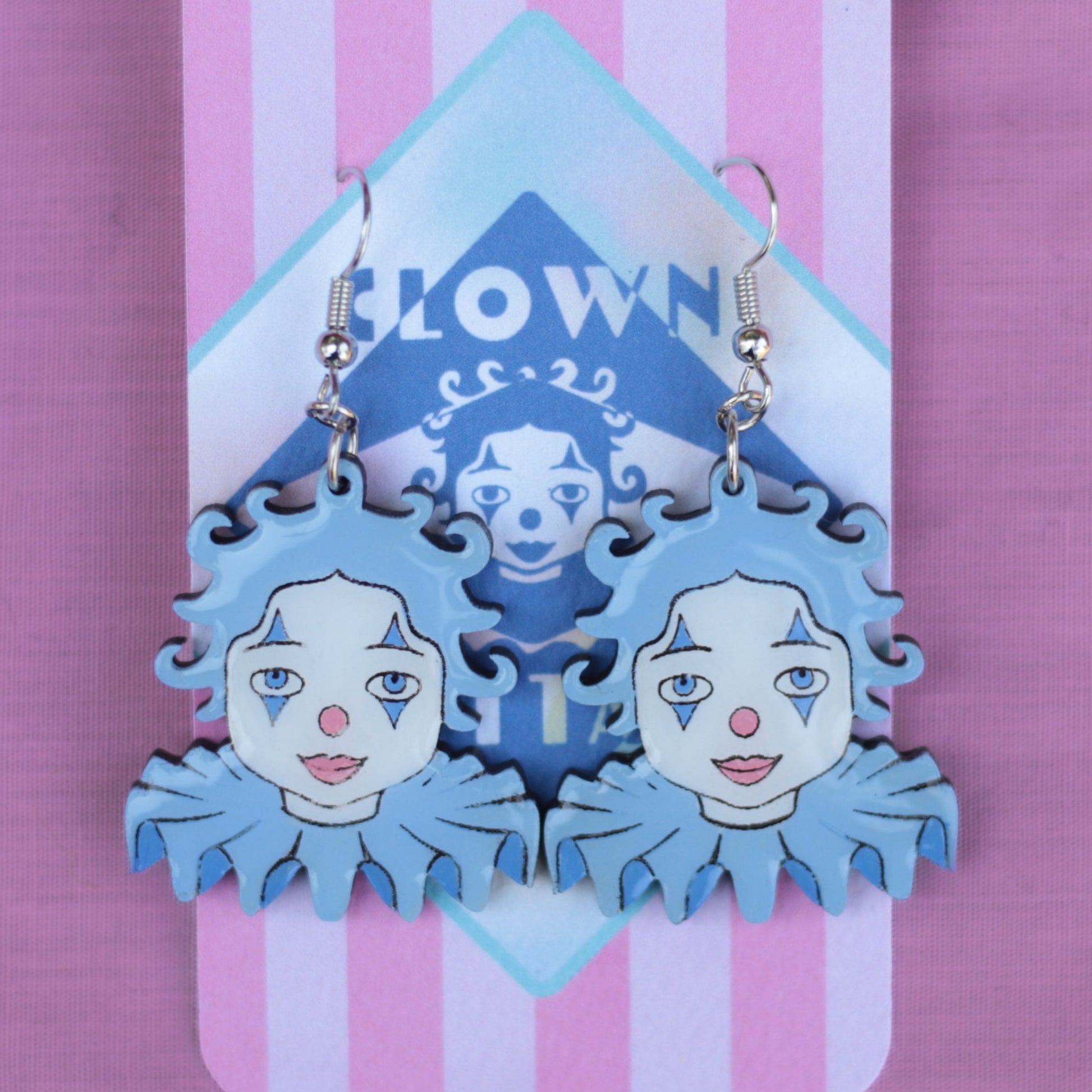 These beautiful clown earrings are made using laser-cut MDF, acrylic paint, resin, and nickel-free metal ear wires.