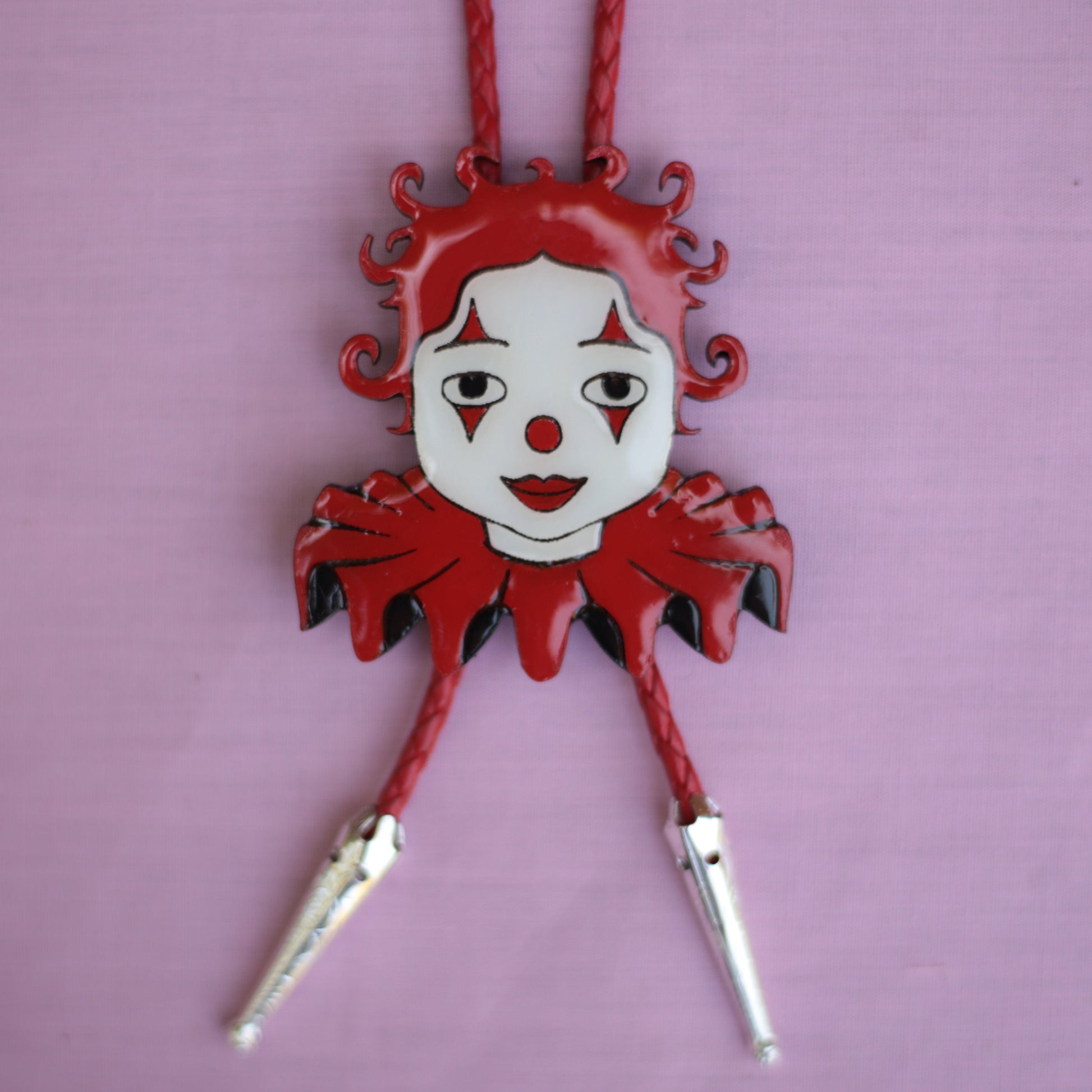 These beautiful clown bolo ties are made using 100% real leather cord, silver-plated steel bolo tips and slide, laser-cut MDF, acrylic paint, and resin.